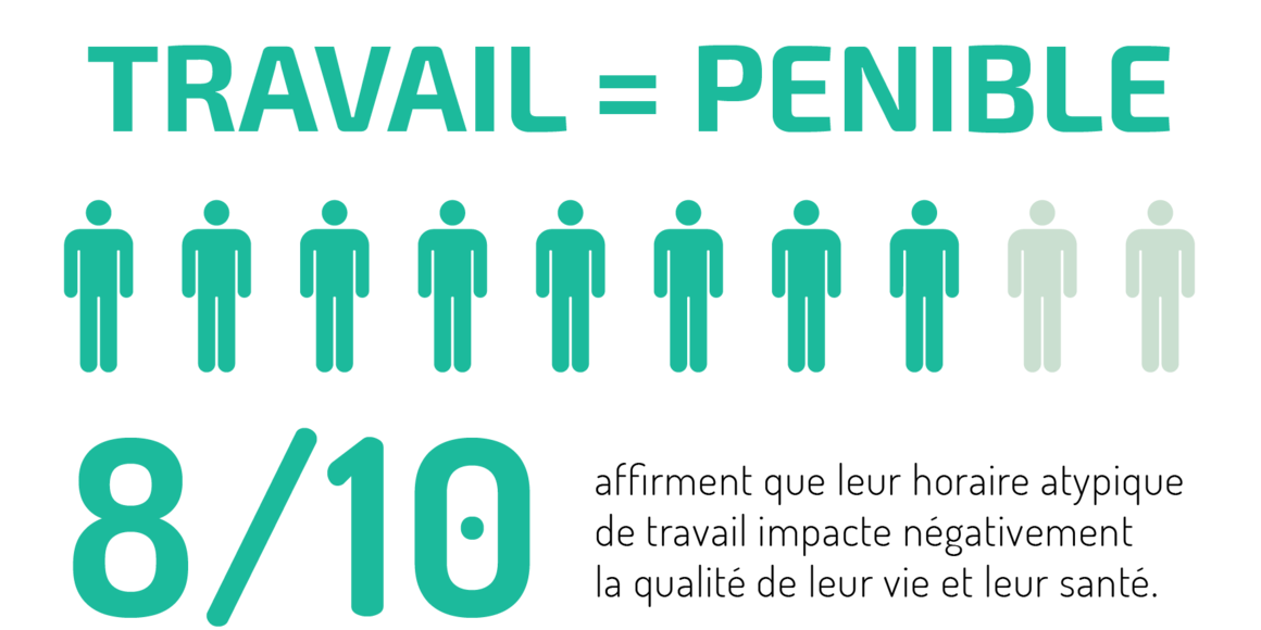 Par le biais de cette enquête, nous voulons alerter les employeurs et le gouvernement. Sans conditions de travail qui prennent en compte la pénibilité de ces régimes, il sera de plus en plus difficile de trouver de la main-d’œuvre qui acceptera de sacrifier sa santé et sa vie privée sans la moindre considération. Contrairement aux orientations prises par l’Arizona, il apparaît urgent de tenir compte de la pénibilité vécue par ces travailleurs. Il ne s’agit pas d’octroyer un privilège : l’impact des horaires atypiques sur la santé et la qualité de vie sont malheureusement une réalité.