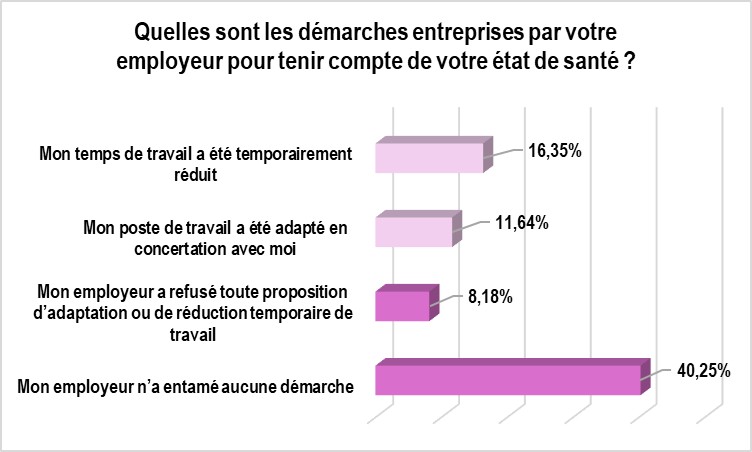 De plus, près de la moitié des répondantes (48,43%) indiquent que leur état de santé n’est pas pris en considération lors de leur retour au travail. Le graphique ci-dessous illustre que le temps de travail ou le poste de travail sont à peine adaptés. Pire : certains employeurs refusent toute proposition d’adaptation ou ne font aucune démarche à cet égard. En d'autres termes, on attend d'une personne qu'elle continue à travailler de la même manière, même si sa santé ne le lui permet pas (encore).