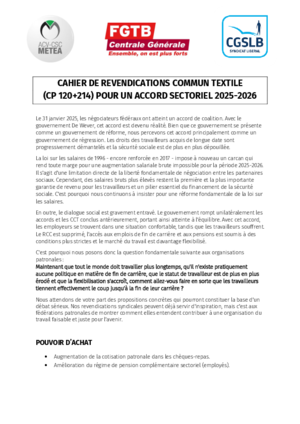 Le 15 octobre 2025, les trois syndicats, CSC, FGTB et CGSLB, ont présenté leur cahier de revendications commun à la fédération patronale Fedustria. Les négociations ont commencé le 22 octobre 2025.