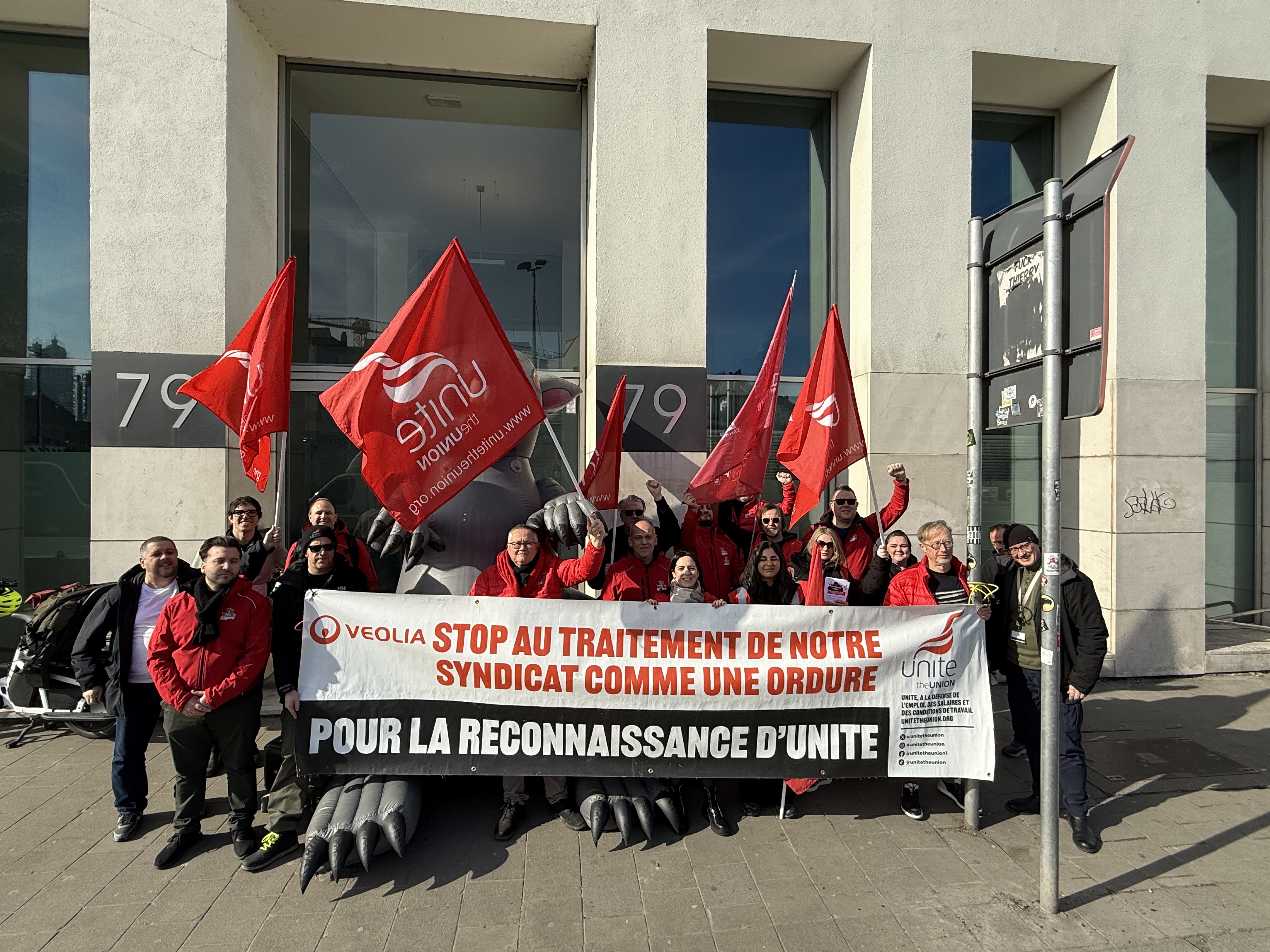 Militanten en leden van Unite the Union, de grootste vakbond van het Verenigd Koninkrijk, reizen deze week naar Brussel om zich te richten tot de hoofdaandeelhouders van Veolia in het kader van een langdurige campagne voor de erkenning van Unite in het afvaldepot van Sheffield.