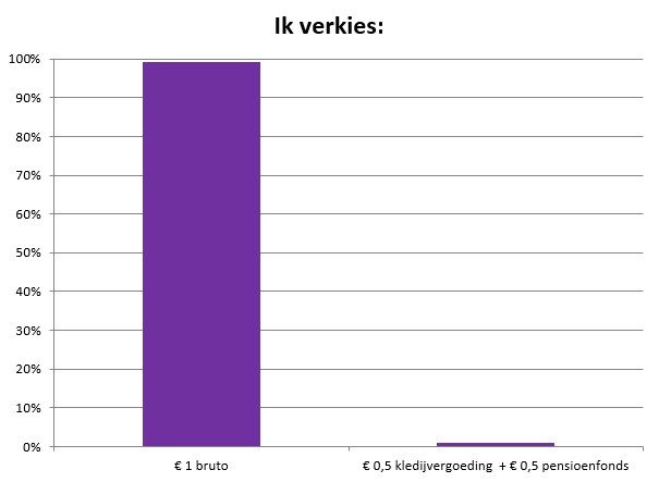Om een keuze te kunnen maken tussen bruto of netto, is duidelijke en transparante informatie essentieel. Daarom werden de deelnemende huishoudhulpen geïnformeerd over wat de twee keuzes inhielden. Concreet: een verhoging met één euro bruto per uur betekent eveneens een verhoging van de eindejaarspremie met €82, van het vakantiegeld met €303, een hoger pensioen, een geïndexeerd brutoloon, maar ook €4,5 meer per ziektedag en een loonsverhoging die wordt toegepast op feestdagen of in geval van werkloosheid.