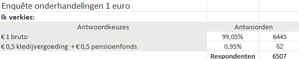 Om na te gaan wat de huishoudhulpen écht willen, hebben de drie vakbonden een grootschalige enquête gelanceerd. Deze had een enorm succes, gezien de resultaten in minder dan 24 uur onbetwistbaar zijn: 99,05% van de huishoudhulpen (meer dan 6.500 op het moment van schrijven!) die op deze enquête reageerden, geeft de voorkeur aan een bruto loonsverhoging.