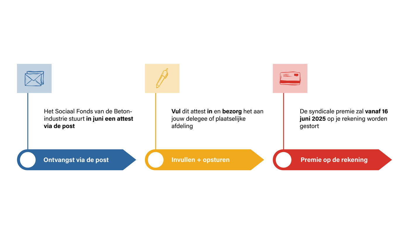 Je ontvangt in juni een tewerkstellingsattest via de post. Het is belangrijk dat je dit attest correct, duidelijk leesbaar en volledig invult. Vergeet ook niet om jouw rekeningnummer te vermelden, zodat we je premie kunnen storten. Eens ingevuld, bezorg je het attest aan jouw plaatstelijke afdeling van ABVV Betonindustrie of aan je afgevaardigde.