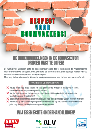 De werkgevers weigeren zelfs de enige loonsverhoging toe te kennen die de Arizonaregering voor de bouwvakkers mogelijk heeft gemaakt. Ze willen namelijk geen bijdrage leveren van €2 voor het invoeren/verhogen van maaltijdcheques! Meer nog, in hun eisenbundel kiezen de werkgevers resoluut voor het pad van sociale afbraak.