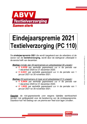 De eindejaarspremie 2021 aan de arbeiders in de textielverzorging wordt door de werkgever uitbetaald in de eerste helft van december. In bijlage kan je de bedragen per gepresteerd uur terugvinden die van toepassing zijn in de sector. Downloaden
