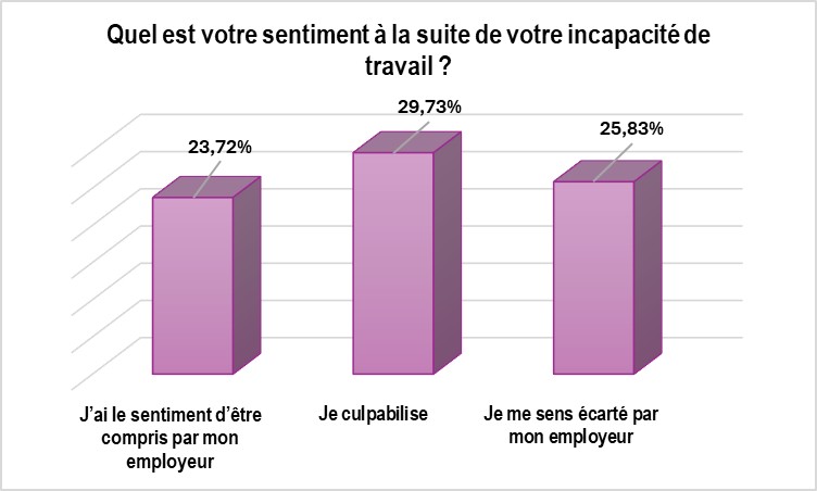 L'impact ne se fait pas seulement ressentir au niveau de l’organisation, mais également sur le plan émotionnel. Plus d'un quart (voir graphique ci-dessous) des travailleuses se sentent mises à l'écart par leur employeur, 29,73 % déclarent éprouver un sentiment de culpabilité à propos de leur absence pour cause de maladie et 1 travailleuse sur 4 seulement déclare se sentir comprise par son employeur. Ici aussi, les chiffres sont éloquents : les femmes subissent une charge émotionnelle plus lourde du fait de l’absence d’une gestion bienveillante du bien-être dans leur entreprise.