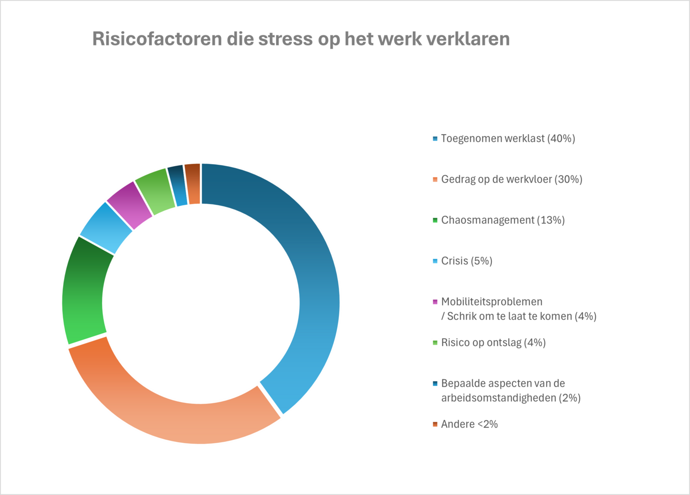 De belangrijkste factor, goed voor 40% van de ervaren druk op de werkvloer, is de toegenomen werklast. Het gaat om een gevoel van te veel werk in te weinig tijd, een constante druk vanuit de organisatie, onregelmatige uurroosters en de nood om zich voortdurend aan te passen aan veranderingen die moeilijk bij te houden zijn.