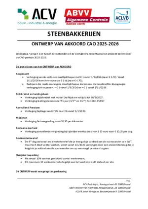Woensdag 7 januari is er tussen de vakbonden en de werkgevers een ontwerp van akkoord bereikt voor de cao-periode 2025-2026. De grote lijnen van het ontwerp vind je in dit document. Downloaden